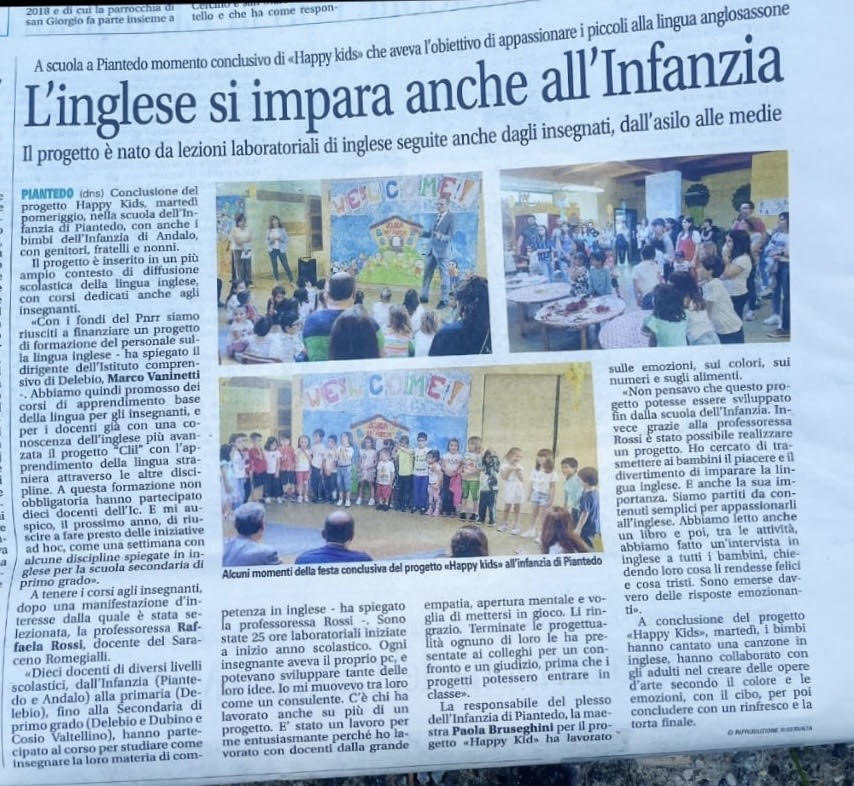 Da anni è ormai consolidato nel nostro Istituto il progetto relativo alla lingua inglese nella scuola dell'infanzia. Il progetto, rivolto in particolare ai bambini che frequentano l'ultimo anno, mira alla costruzione di un approccio ludico e divertente alla lingua inglese attraverso attività coinvolgenti ed esperienziali. Quest'anno, grazie ai corsi di formazione organizzati dall'Istituto per il personale con i fondi del PNRR - DM 65, i docenti partecipanti hanno potuto implementare le proprie competenze sulla lingua inglese, e garantire così un'offerta formativa ancora più consapevole agli alunni dell'Istituto. A seguire una delle iniziative realizzate alla fine del progetto.